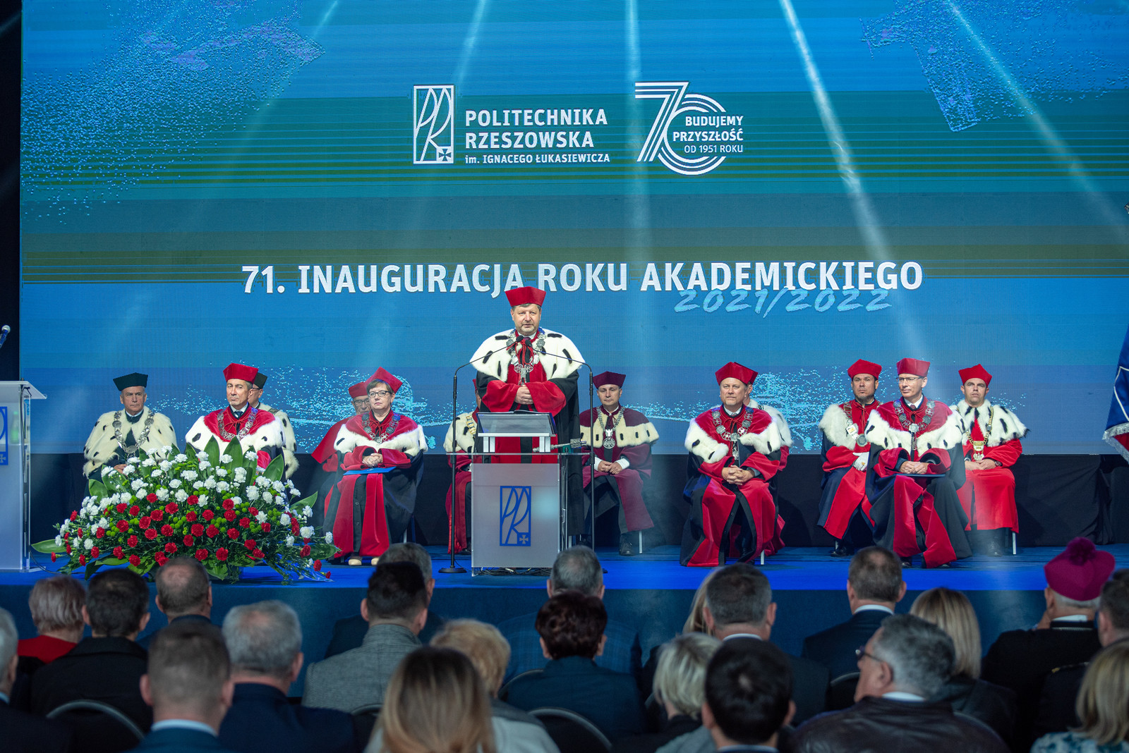 „Inaugurujemy 71. rok istnienia Politechniki Rzeszowskiej im. Ignacego Łukasiewicza, dla wielu tu obecnych „naszej Uczelni”. Instytucji, która od dziesiątków lat pełni rolę nie tylko szkoły inżynierów, lecz także wiodącego ośrodka badawczego, w której powstają pomysły, realizowane są projekty badawcze wdrażane w przemyśle. Jest to efekt wieloletniej pracy i zaangażowania ludzi Politechniki – tysięcy pracowników byłych i obecnych, zatrudnionych w różnych grupach oraz setki tysięcy studentów i absolwentów. Każdy z nich zostawił tu jakiś ślad” – tymi słowami JM Rektor prof. dr hab. inż. Piotr Koszelnik rozpoczął swoje przemówienie.