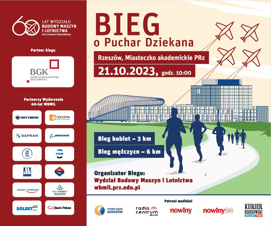 W najbliższą sobotę 21 października br. odbędzie się kolejne z cyklu wydarzeń upamiętniających 60-lecie Wydziału Budowy Maszyn i LotnictwaBieg o Puchar Dziekana. Wydarzenie odbędzie się na miasteczku Politechniki Rzeszowskiej przy Alei Powstańców Warszawy.