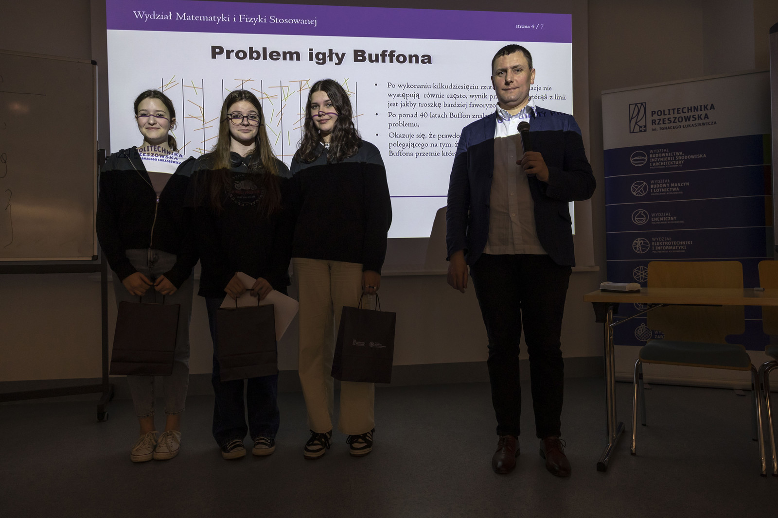 Uczestników wydarzenia przywitała prodziekan ds. kształcenia WMiFS dr Małgorzata Wołowiec-Musiał. Następnie głos zabrała prorektor ds. kształcenia dr hab. Iwona Włoch, prof. PRz, która podkreśliła, że jest to święto matematyki, a Międzynarodowy Dzień Liczby Pi obchodzony na całym świecie obfituje w różne wydarzenia i konkursy związane z tą dziedziną nauki. „Politechnika Rzeszowska jest uczelnią techniczną, na której prowadzi się kształcenie oparte na matematyce. Inżynier i matematyk to są kierunki przyszłości, a dzisiejsze wydarzenie związane z organizacją wielu paneli popularno-naukowych przyczyni się do tego, że dowiecie się Państwo więcej o tej niezwykłej liczbie Pi, wokół której rozwija się nie tylko matematyka, ale i technika. Dzisiaj sobie nie wyobrażamy, że ta liczba nie byłaby znana. Życzę Państwu zainspirowania się dzisiejszymi wykładami, podziwu i zachwytu matematyką oraz liczbą Pi” – powiedziała prorektor prof. I. Włoch, informując, że Politechnika Rzeszowska jako jedna z niewielu uczelni technicznych kształci studentów na kierunku matematyka i ma wiele osiągnięć naukowych w tej dyscyplinie. Posiada również uprawnienia do nadawania stopni naukowych doktora i doktora habilitowanego w dyscyplinie matematyka. Uczestnicy wydarzenia mogli również zapoznać się z ofertą kształcenia na Wydziale Matematyki i Fizyki Stosowanej, którą przedstawiła prodziekan ds. kształcenia dr Urszula Bednarz. W spotkaniu uczestniczyli także dziekan WMiFS dr hab. Czesław Jasiukiewicz, prof. PRz oraz prodziekan ds. rozwoju dr Sławomir Wolski.